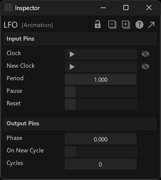 The Inspector Invoked via CtrlI the Inspector gives you an overview of a selected Node, Pad or IOBox. Inspecting an LFO [Animation] node