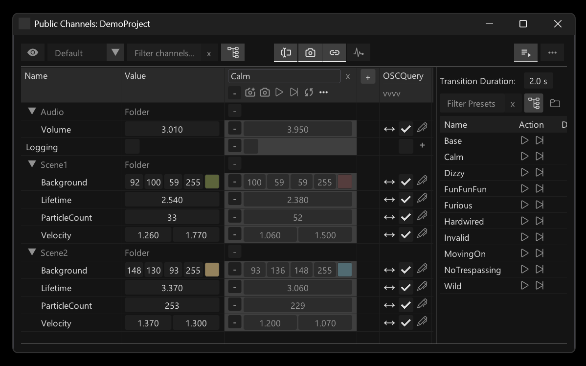 It lists and allows editing of all your public channels, allows you to store and re-call snapshots of their values using Presets and with just a few clicks allows you to expose them to the world via the idea of Bindings.