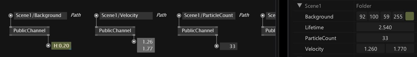 Once defined like this, the value of a public channel can be controlled via the Channel Browser or from another PublicChannel node given the same path. And being a channel, this also means you get bi-directional ie. read/write access to it!